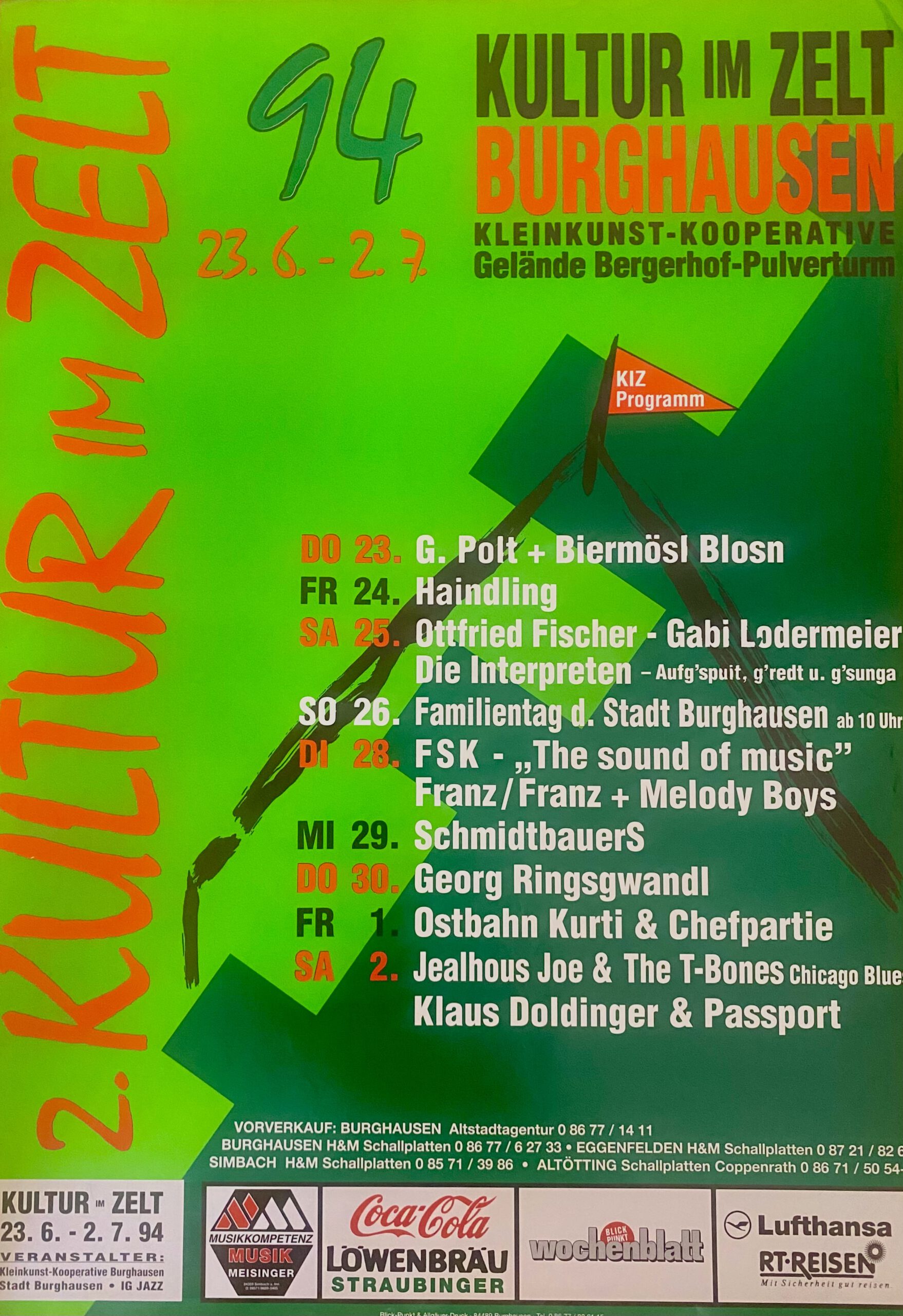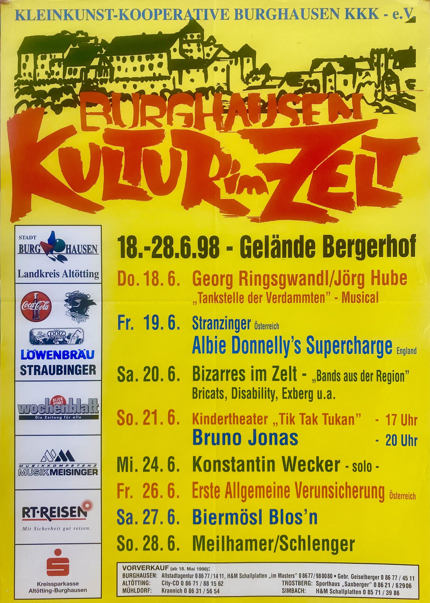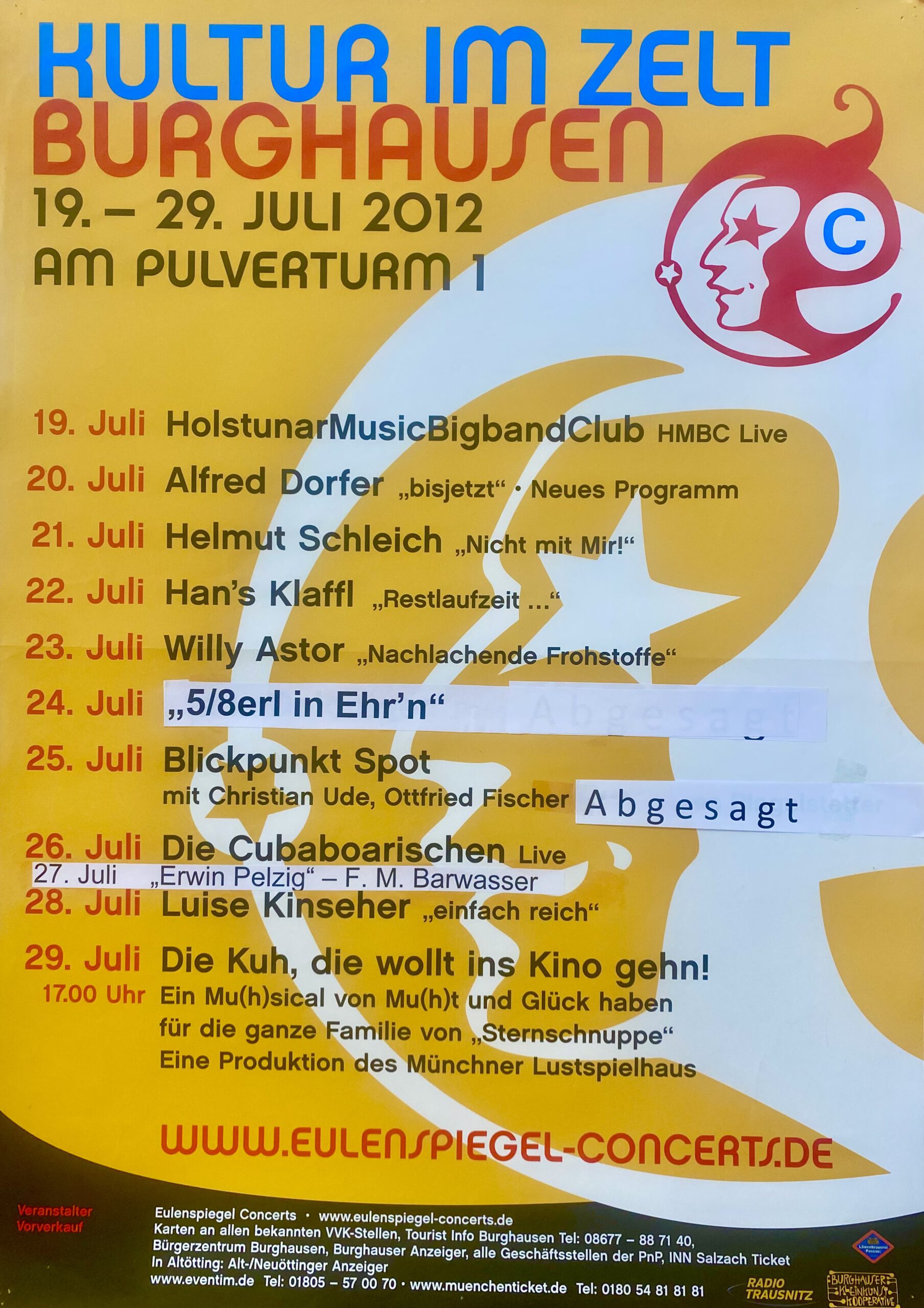 Was gibt es Schöneres als ein Sommer-Festival im Grünen mit Blick auf die längste Burg der Welt? Bei „Kultur im Zelt“ schlagen immer noch viele Herzen höher und Erinnerungen an kultige Konzerte und laue Sommerabende werden wach. Eingebettet in eine atemberaubende Landschaft, die den Blick hoch über dem Wöhrsee auf die Burg freigibt, steht im Sommer ein Zirkuszelt mit angeschlossenem Biergarten. Das Festival wartet mit einem bunten Programm auf und im Zusammenspiel von Stadt Burghausen, IG Jazz, der KleinKunstKooperative, der move too hot company und anderen Partnern wird ein hochkarätiges Line-Up von Konzerten über Kabarett bis hin zur Artistik auf die Beine gestellt.